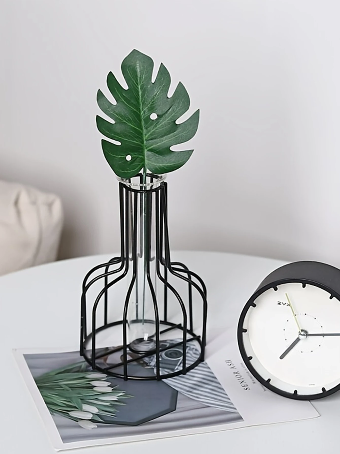 The tall glass cylinder creates a beautiful aesthetic against the strong iron art support. This vase is suitable to hold water.